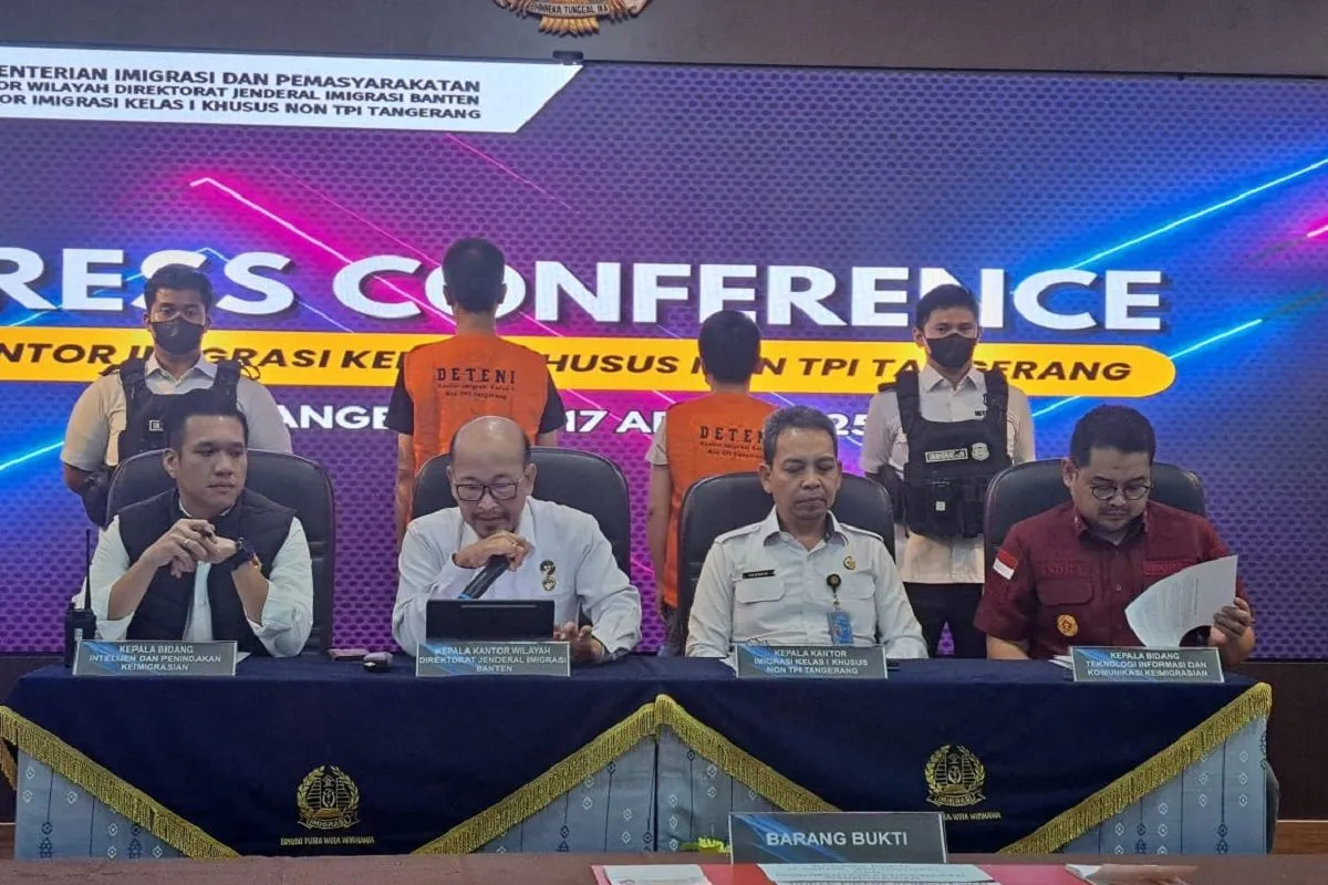 Kepala Kantor Wilayah Direktorat jenderal imigrasi Banten Hendro Tri Prasetyo (kedua dari kiri) didampingi Kepala Imigrasi Kelas I Non TPI Tangerang Hasanin (ketiga dari kiri) bersama dari Tim Inteldakim Kantor Imigrasi Kelas I Khusus Non TPI Tangerang saat memberikan keterangan kepada media. ANTARA/Irfan