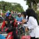 Antusiasme terlihat dari para sopir truk dan pengguna jalan lain yang menerima bendera dengan senang hati dan langsung memasangnya di kendaraan masing-masing.