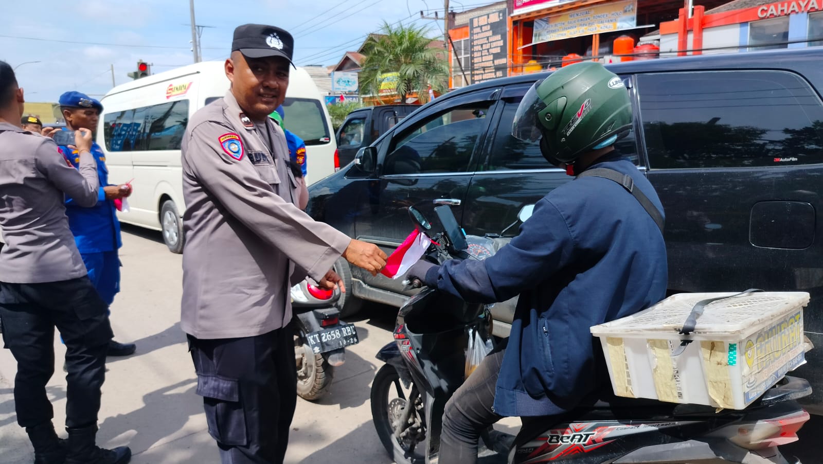 Kegiatan yang berlangsung dengan penuh semangat kebangsaan ini dihadiri langsung oleh Kapolres Kutim, AKBP Fauzan Arianto, S.H., S.I.K., M.H., beserta para Pejabat Utama (PJU) Polres Kutim. Mereka turun langsung ke jalan membagikan bendera kepada para pengemudi kendaraan roda dua (R2) dan roda empat (R4) yang melintas di lokasi tersebut.