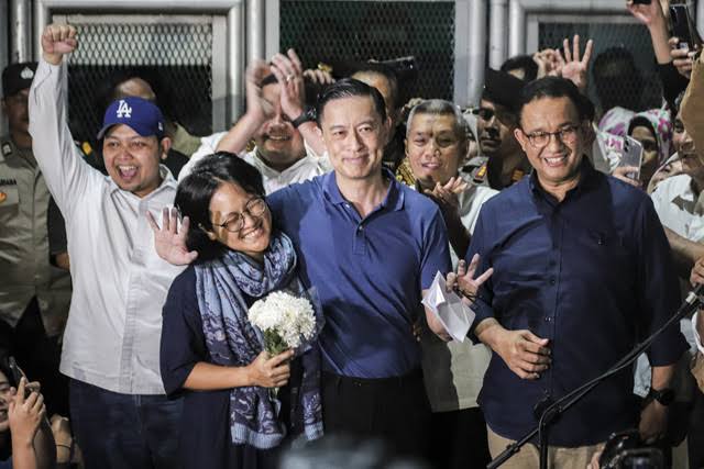 Sekitar pukul 22.03 WIB, Tom Lembong tampak melangkah keluar dari balik jeruji besi dengan senyum lebar. Ia langsung disambut hangat oleh para pendukung dan kolega yang menanti di luar sejak pagi. Salah satu sosok yang hadir mendampingi adalah Anies Baswedan, yang terlihat ikut menyapa para simpatisan.